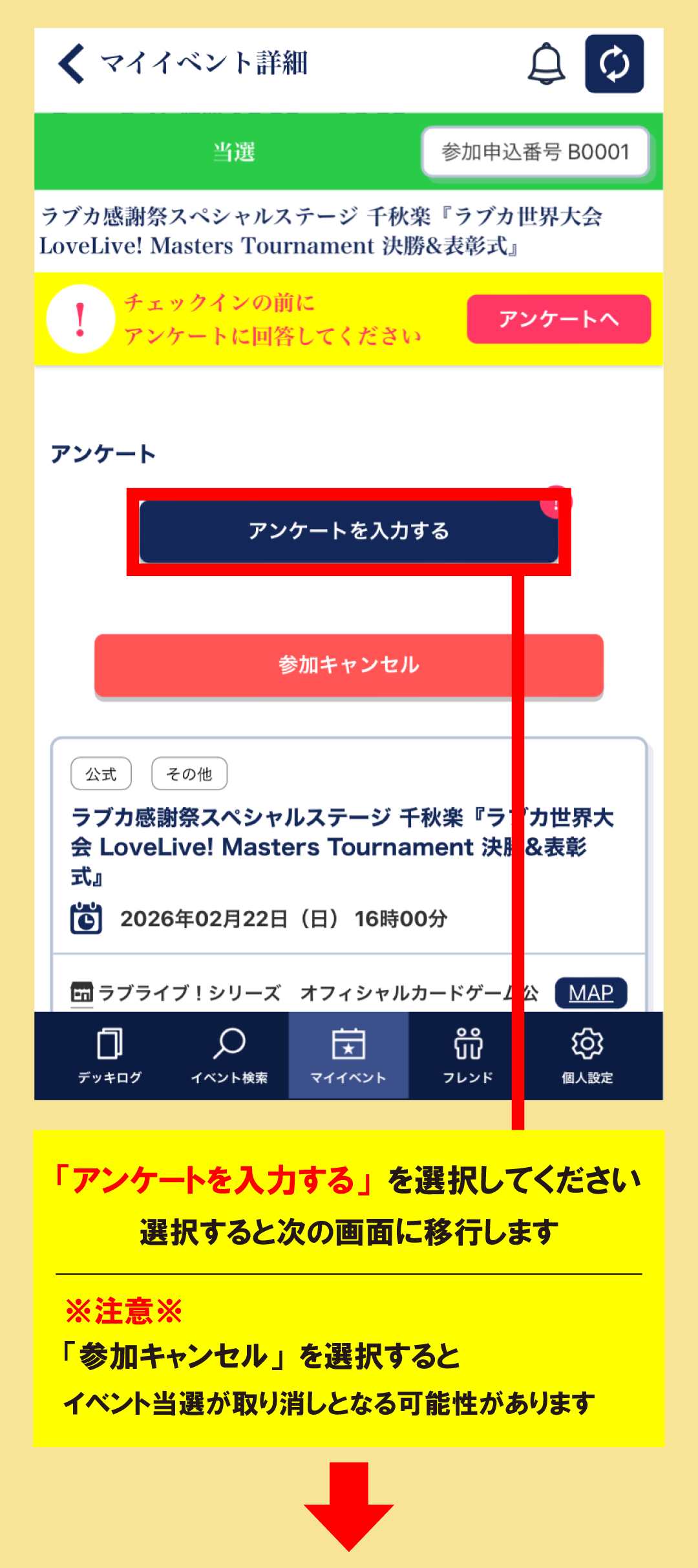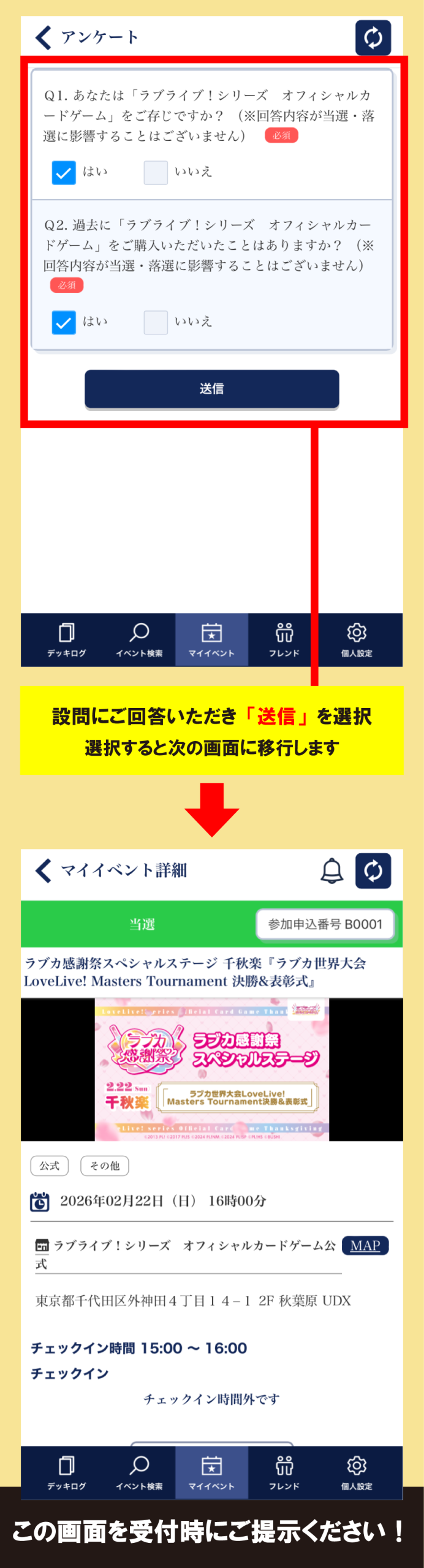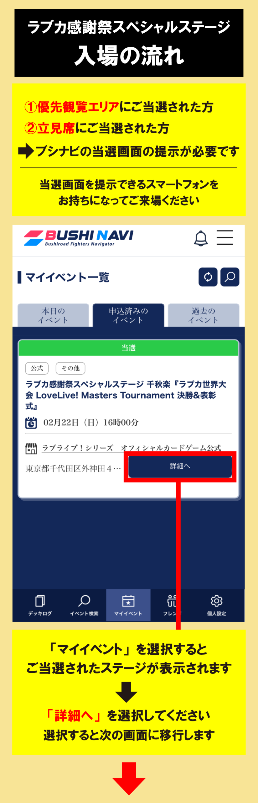 ・ご入場の際に受付にて当選確認を行います。お手持ちの端末で「ブシナビ」の当選画面をご用意のうえでご集合ください。